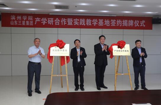 簽約儀式中,濱州學(xué)院副校長李偉年、三星集團副總經(jīng)理孫喜代表雙方簽約,李長海、皮臺田、崔本明、王明峰分別為實踐教學(xué)基地及產(chǎn)學(xué)研合作基地揭牌。