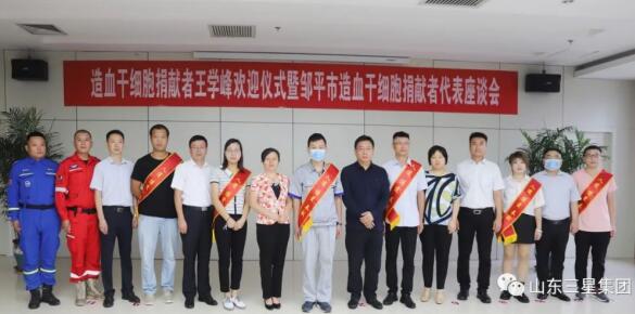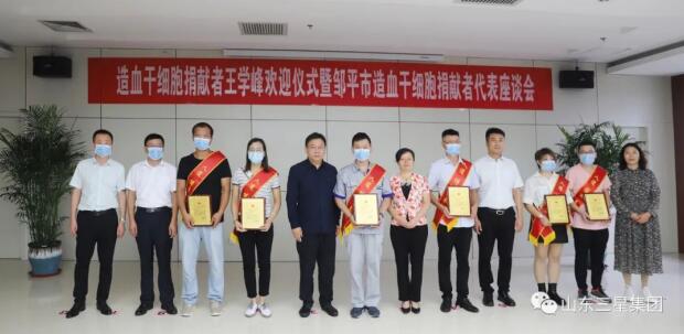 9月16日,造血干細(xì)胞捐獻(xiàn)者王學(xué)峰歡迎儀式暨鄒平市造血干細(xì)胞捐獻(xiàn)者代表座談會(huì)在山東三星集團(tuán)舉行。濱州市紅十字會(huì)黨組書記、常務(wù)副會(huì)長田洪健,鄒平市副市長韓穎、市委宣傳部常務(wù)副部長李偉,韓店鎮(zhèn)副鎮(zhèn)長馬金萍,鄒平市紅十字會(huì)常務(wù)副會(huì)長張維敏,山東三星集團(tuán)常務(wù)副總經(jīng)理王明亮、副總經(jīng)理孫喜、綜合管理部經(jīng)理韓延庭,本次造血干細(xì)胞捐獻(xiàn)者王學(xué)峰及鄒平市前5位造血干細(xì)胞捐獻(xiàn)者出席座談會(huì)。