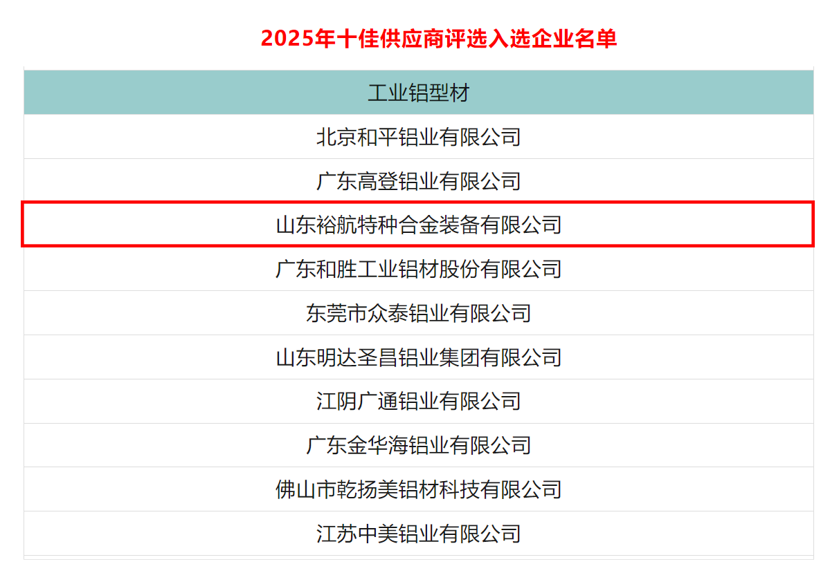 近日,由世鋁網(wǎng)主辦的2025十佳供應(yīng)商評選活動圓滿收官。憑借雄厚的產(chǎn)業(yè)實力和領(lǐng)先的科創(chuàng)水平,裕航合金公司再次入選“工業(yè)鋁型材”十佳供應(yīng)商。
