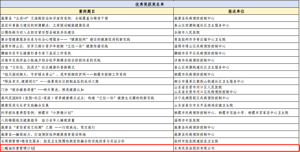 8月2日,第二屆山東省健康促進(jìn)大會在淄博召開。會上,長壽花食品《二酯油體重管理計劃》案例,憑借其突出的創(chuàng)新性與實(shí)效性,榮獲健康促進(jìn)優(yōu)秀實(shí)踐案例。