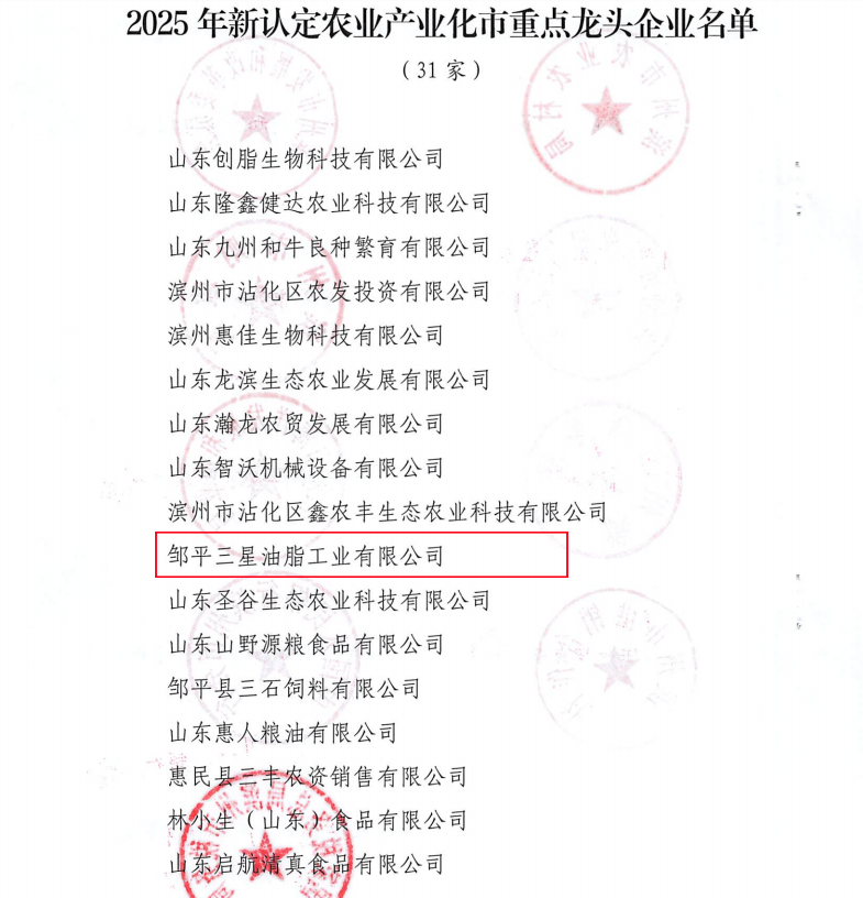 近日,濱州市農(nóng)業(yè)農(nóng)村局等聯(lián)合發(fā)布了2025年新認定農(nóng)業(yè)產(chǎn)業(yè)化市重點龍頭企業(yè)名單,鄒平三星油脂工業(yè)有限公司憑借其在糧油加工領(lǐng)域的卓越實力和行業(yè)領(lǐng)先地位,入選該名單。
