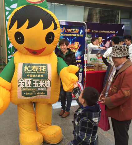 從長(zhǎng)壽花總部風(fēng)塵仆仆趕來(lái)的不僅僅是各種豐厚的禮品,還有“長(zhǎng)壽花金胚玉米油”的卡通形象——憨態(tài)可掬的金胚娃娃。在活動(dòng)現(xiàn)場(chǎng),這位“金胚娃娃”手舞足蹈的樣子瞬間吸引了不少游客的注意力,引爆了在場(chǎng)多數(shù)人的“萌點(diǎn)”,眾多小朋友和萌妹子紛紛上前要求合影,一時(shí)間風(fēng)頭無(wú)兩,從而也給顧客留下了“長(zhǎng)壽花金胚玉米油”美好的印象。