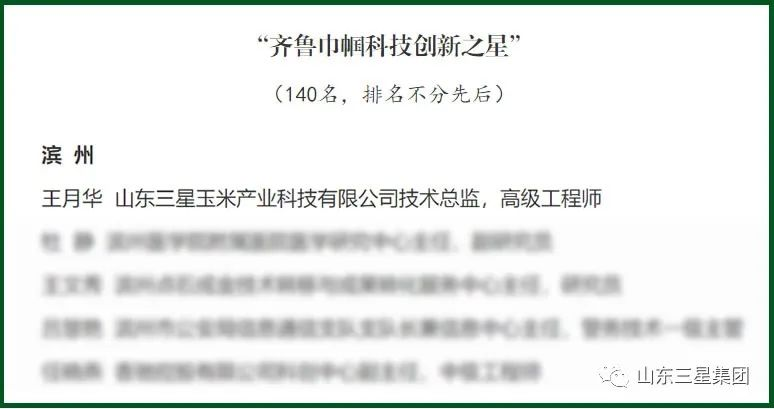近期,山東省婦聯(lián)、山東省科技廳、山東省科協(xié)聯(lián)合發(fā)布“齊魯巾幗科技創(chuàng)新之星”榮譽(yù)名單。長(zhǎng)壽花食品(原三星玉米產(chǎn)業(yè)公司)技術(shù)總監(jiān)、高級(jí)工程師王月華,高端糧油領(lǐng)域創(chuàng)新成果豐碩、科研業(yè)績(jī)突出,繼“濱州市巾幗科技創(chuàng)新之星”之后,再獲“齊魯巾幗科技創(chuàng)新之星”榮譽(yù)稱號(hào)。