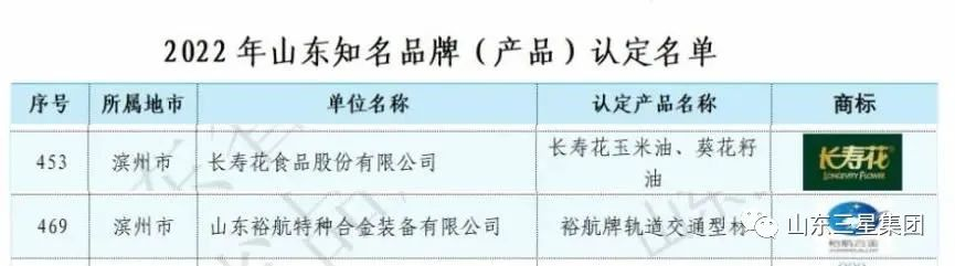 近日,2022年山東知名品牌認(rèn)定名單發(fā)布,來自全省541家組織的502個(gè)產(chǎn)品、97個(gè)服務(wù)項(xiàng)目上榜,山東三星集團(tuán)旗下長(zhǎng)壽花玉米油、葵花籽油以及裕航合金軌道交通型材三個(gè)產(chǎn)品被認(rèn)定為2022年山東知名品牌。