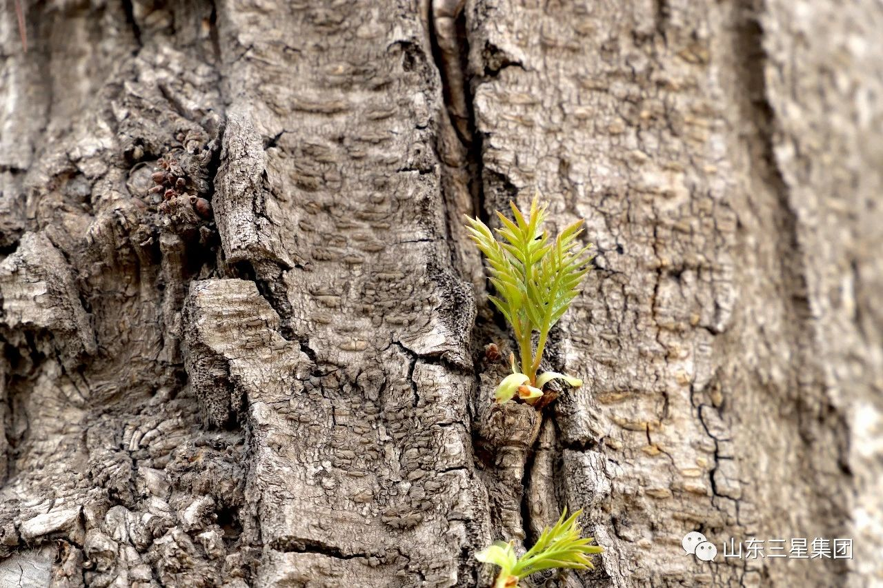 斑駁的樹干上冒出幾枝新芽
