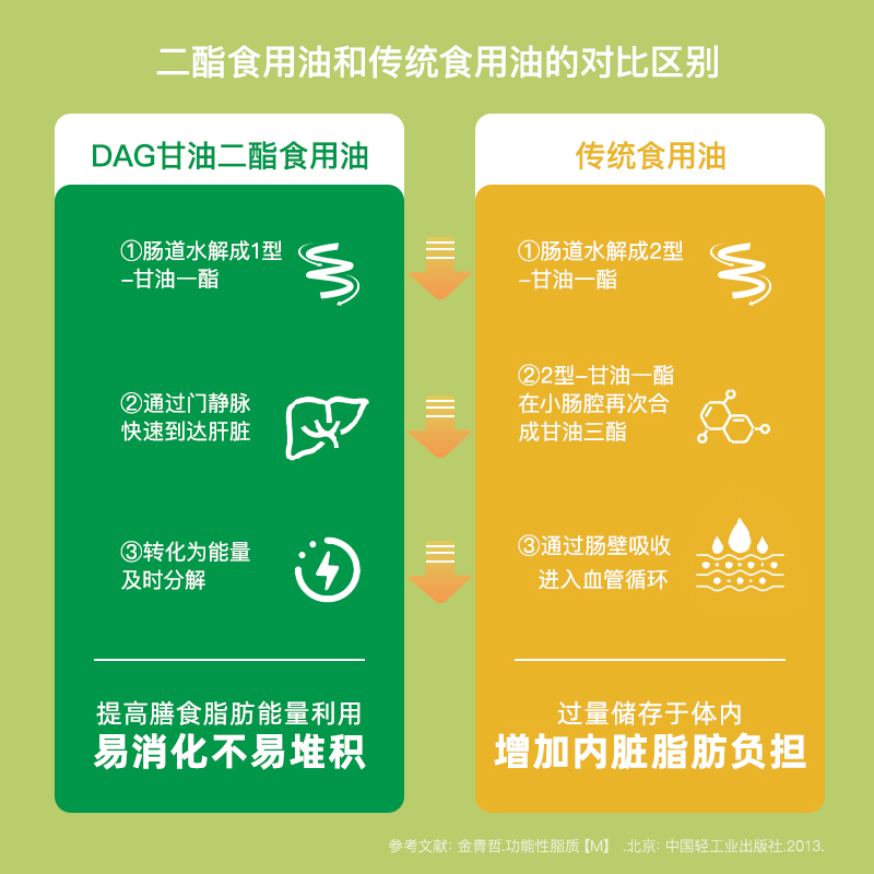 甘油二酯不同于甘油三酯。由于在結(jié)構(gòu)上缺少一個脂肪酸,甘油二酯在經(jīng)小腸粘膜細(xì)胞消化吸收后,無法合成甘油三酯結(jié)構(gòu)進入血液,而是由號稱“細(xì)胞發(fā)電站”的線粒體代謝供能,不易在體內(nèi)造成脂肪累積。因此廣受關(guān)注。