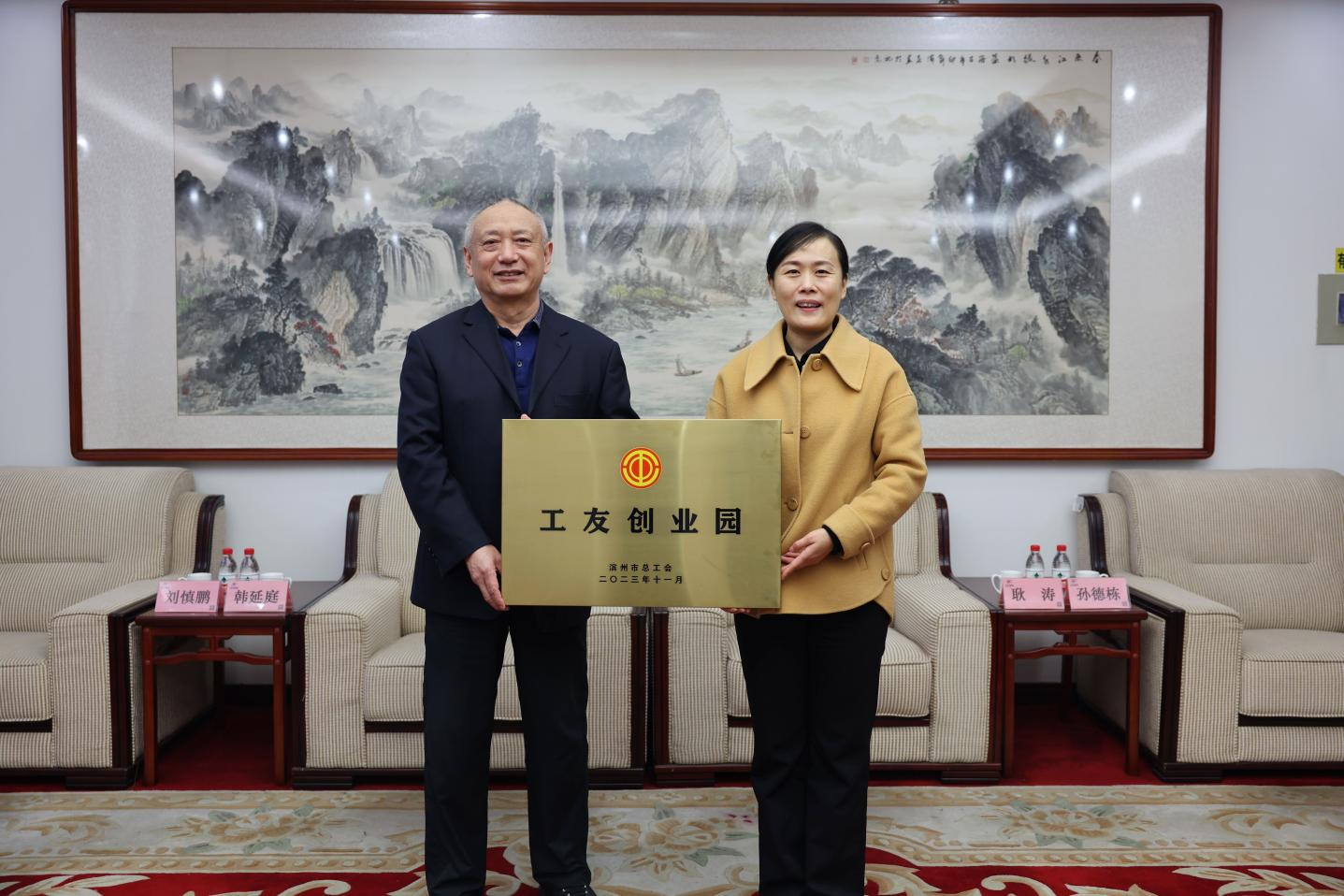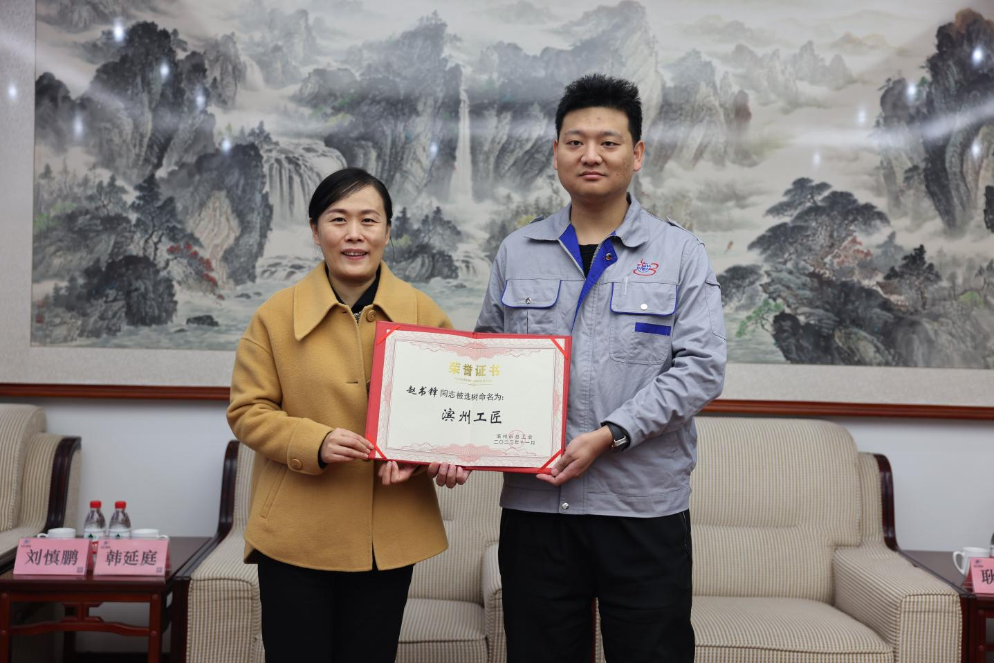 王萌首先為企業(yè)授牌濱州市“工友創(chuàng)業(yè)園”,為榮獲“濱州市五一勞動獎?wù)隆薄盀I州工匠”的孫鋼、趙書鋒頒發(fā)獎牌、證書,對他們在各自崗位上取得的不凡成績給予充分肯定,并鼓勵他們在新時代、新征程中接續(xù)奮斗,再立新功,同時,要求企業(yè)接續(xù)弘揚(yáng)勞動精神、工匠精神,把先進(jìn)典型的事跡講述好、宣傳好,打造創(chuàng)新創(chuàng)業(yè)新高地。