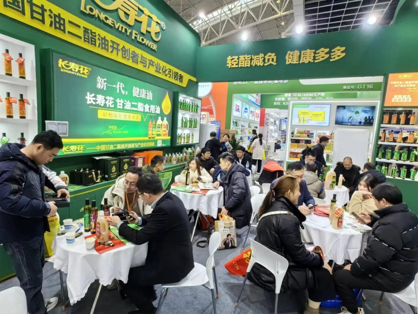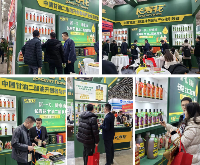 本次展會上,長壽花食品攜甘油二酯全系列產(chǎn)品驚艷亮相。含量從20%——80%的玉米二酯油、花生二酯油、葡萄籽二酯油、菜籽二酯油、亞麻籽油以及甘油二酯黑咖啡、代餐粉長壽花二酯油粉悉數(shù)到場。長壽花二酯油系列產(chǎn)品憑借其高品質(zhì)、大健康等特點,吸引了眾多參會客商駐足關(guān)注,蒞臨展位探討合作交流。