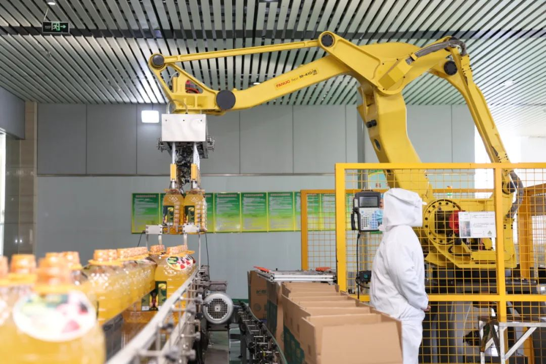 同樣,在長(zhǎng)壽花食品公司的車(chē)間內(nèi),也是一片熱火朝天的生產(chǎn)景象。全自動(dòng)生產(chǎn)線上,吹瓶、灌裝并封蓋、燈檢、貼標(biāo)簽等工序一氣呵成。最后,智能機(jī)械臂一次抓取12桶油,放進(jìn)3個(gè)包裝箱,封裝后傳送至倉(cāng)庫(kù)。