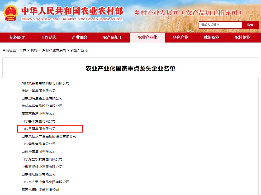 近日,農(nóng)業(yè)農(nóng)村部公布了新一批“農(nóng)業(yè)產(chǎn)業(yè)化國家重點龍頭企業(yè)”名單,山東三星集團(tuán)順利通過監(jiān)測評估,自2011年通過認(rèn)定以來,已連續(xù)15年被認(rèn)定為農(nóng)業(yè)產(chǎn)業(yè)化國家重點龍頭企業(yè)。