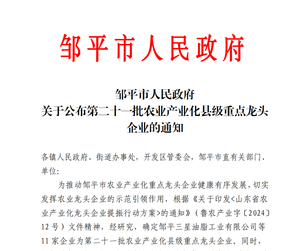 近日,鄒平市人民政府公布了新一批農(nóng)業(yè)產(chǎn)業(yè)化縣級重點龍頭企業(yè)名單,集團(tuán)旗下鄒平三星油脂工業(yè)有限公司被認(rèn)定為農(nóng)業(yè)產(chǎn)業(yè)化縣級重點龍頭企業(yè)。