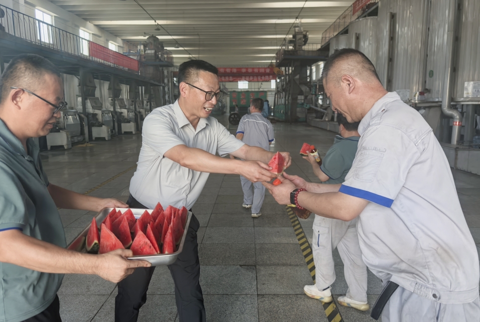 近日,持續(xù)的高溫天氣給堅守崗位的一線員工帶來嚴(yán)峻“烤”驗。為切實保障炎炎夏日一線員工身心健康,長壽花糧油加工公司執(zhí)行總經(jīng)理王學(xué)剛、長壽花食品科技公司執(zhí)行總經(jīng)理王奎帶著西瓜、涼茶等降溫物品深入生產(chǎn)車間一線,為員工送去清涼與關(guān)懷。