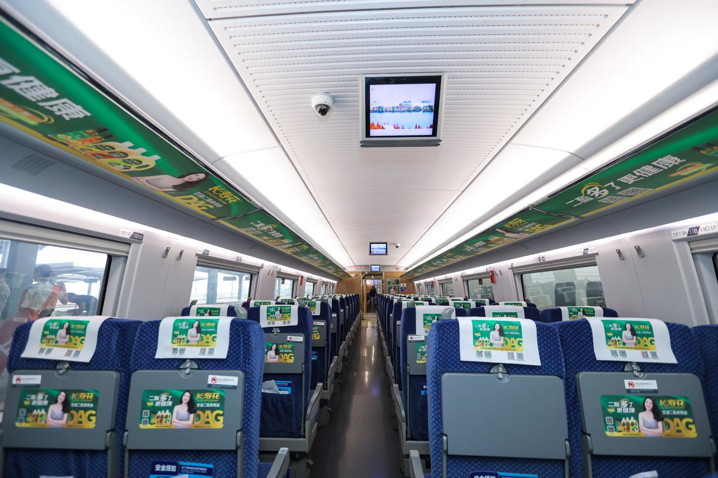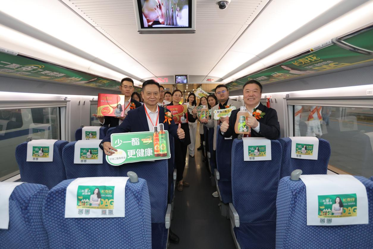 儀式結(jié)束后,與會(huì)領(lǐng)導(dǎo)一行到達(dá)站臺(tái),與“長(zhǎng)壽花甘油二酯食用油號(hào)”高鐵列車合影,并登上首發(fā)班次冠名列車,實(shí)地感受品牌與高鐵場(chǎng)景的深度融合。列車內(nèi)部構(gòu)建了以小桌板、頭巾、行李架、海報(bào)、字幕等為點(diǎn)位的品牌傳播矩陣,形成360°環(huán)繞式品牌空間。